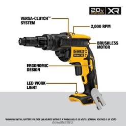The DeWALT Versa-Clutch adjustable torque screw gun delivers a top speed of 2000 RPM and is perfect for metal fastening applications. Brushless motor delivers optimum efficiency and enhanced runtime. Versa-Clutch mechanism prevents any damage to the material as well as to the fasteners. Integrated LED brightens up the work space for more visibility in dark areas.