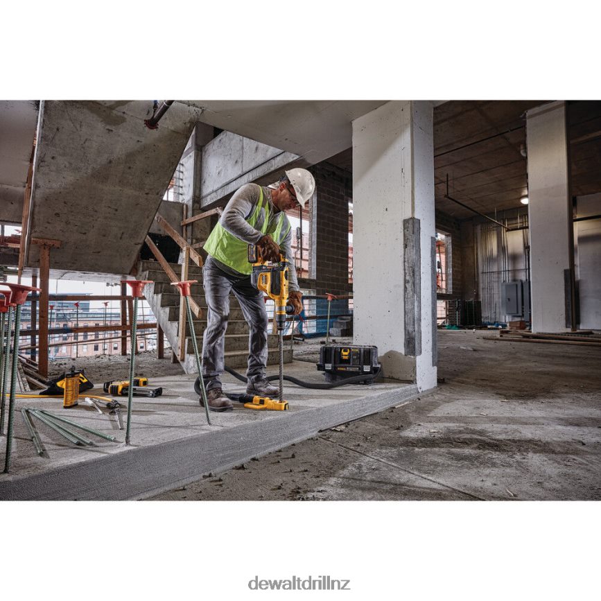 The DeWALT 60 Volt Max 1-3/4 Inch SDS Max combination rotary hammer tool is precisely designed to deliver 10.5 Joules of impact energy for fast drilling and chipping, even in the hardest concrete. This lightweight and high-performance hammer is powered by a brushless motor and a durable German engineered mechanism. It is equipped with the constant speed electronics to maintain speed under load. Tool is perfect for high-performance horizontal serial drilling for #5 to 8 rebar, dry coring up to 4 Inch, chipping in any upper to lower wall as well as bushing applications. It is integrated with the patented E-CLUTCH system and the SHOCKS Active Vibration Control system. E-CLUTCH system safeguards the user in bind-up situations by stopping the rotation of the bit. The SHOCKS effectively minimizes vibration felt by the user at the handles, compared to rotary hammers without this feature. This tool comes Tag Ready so users and companies can attach the DeWALT Tag and track its location virtually anywhere via the DeWALT Tool Connect app. The WIRELESS TOOL CONTROL allows to link the tool to the DCV585 60 Volt Max dust extractor for remote extractor activation. It has 7-position, variable-speed control for precision hole placement, chipping and drilling with Atomic Undercut bits.