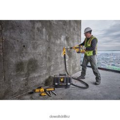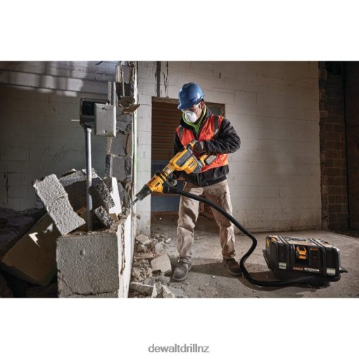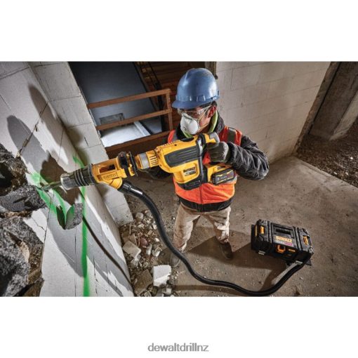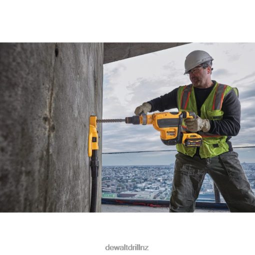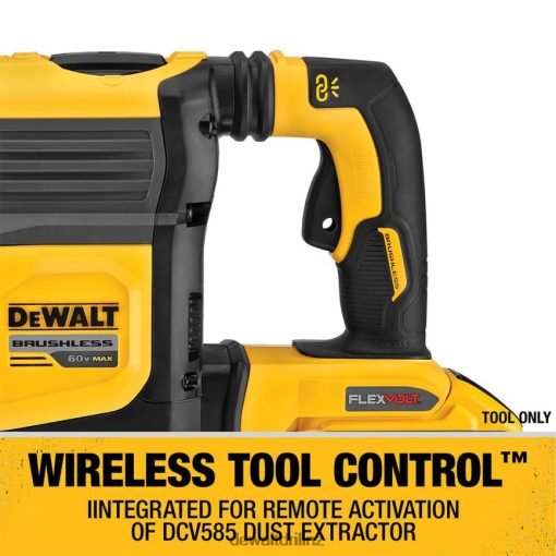 The DeWALT 60 Volt Max 1-3/4 Inch SDS Max combination rotary hammer tool is precisely designed to deliver 10.5 Joules of impact energy for fast drilling and chipping, even in the hardest concrete. This lightweight and high-performance hammer is powered by a brushless motor and a durable German engineered mechanism. It is equipped with the constant speed electronics to maintain speed under load. Tool is perfect for high-performance horizontal serial drilling for #5 to 8 rebar, dry coring up to 4 Inch, chipping in any upper to lower wall as well as bushing applications. It is integrated with the patented E-CLUTCH system and the SHOCKS Active Vibration Control system. E-CLUTCH system safeguards the user in bind-up situations by stopping the rotation of the bit. The SHOCKS effectively minimizes vibration felt by the user at the handles, compared to rotary hammers without this feature. This tool comes Tag Ready so users and companies can attach the DeWALT Tag and track its location virtually anywhere via the DeWALT Tool Connect app. The WIRELESS TOOL CONTROL allows to link the tool to the DCV585 60 Volt Max dust extractor for remote extractor activation. It has 7-position, variable-speed control for precision hole placement, chipping and drilling with Atomic Undercut bits.