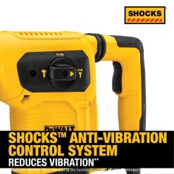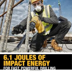 The D25481K 1-9/16 In. SDS max combination hammer, with its durable and hard hitting German engineered mechanism delivers 6 joules of impact energy for fast drilling, even in the hardest concrete. The light weight design makes it ideally suited for horizontal serial drilling for #4 – #8 rebar, coring and chipping in any mid to upper wall and ceiling application. The active vibration control technology employed delivers reduced user vibration for less user fatigue and greater productivity.